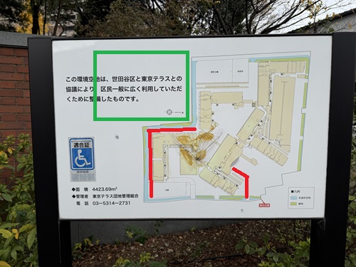 緑の線が歩いた道のり。赤線枠が「東京テラス」