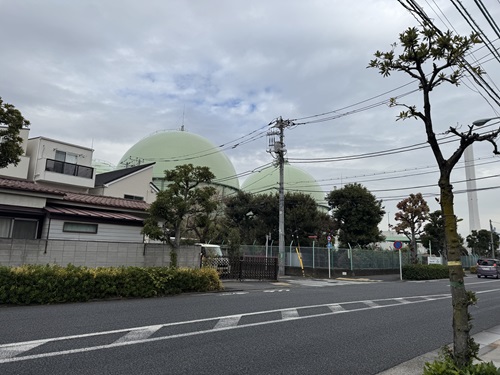 バス停の向こうに、座談会で話題になったガスタンクが見える